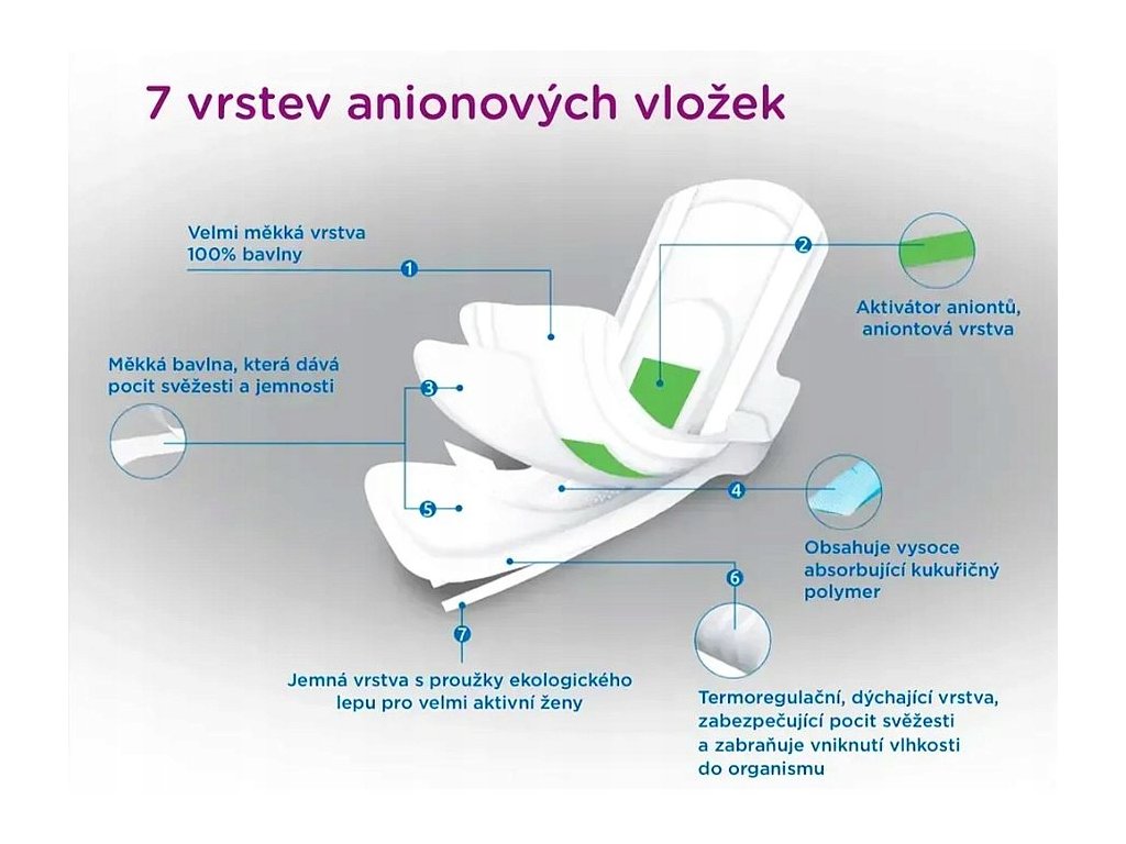 Aniónové hygienické vložky svojimi vlastnosťami predčia bežné dámske menštruačné vložky. Sú obohatené o aktívny kyslík, anióny striebra a sú vyrobené výhradne z prírodných materiálov bez použitia chemikálií, aromatických látok a iných aditív, preto sú vhodné aj pre alergikov a ľudí s citlivou pokožkou. Zabraňujú množeniu baktérií, udržujú optimálne pH pokožky, čím chránia vaše itímne partie, eliminujú nepríjemný zápach, majú vysoké absorbčné schopnosti, ale zároveň sú tenké a nenápadné. Zabezpečia vám dlhodobý pocit sucha, komfortu a pohody.