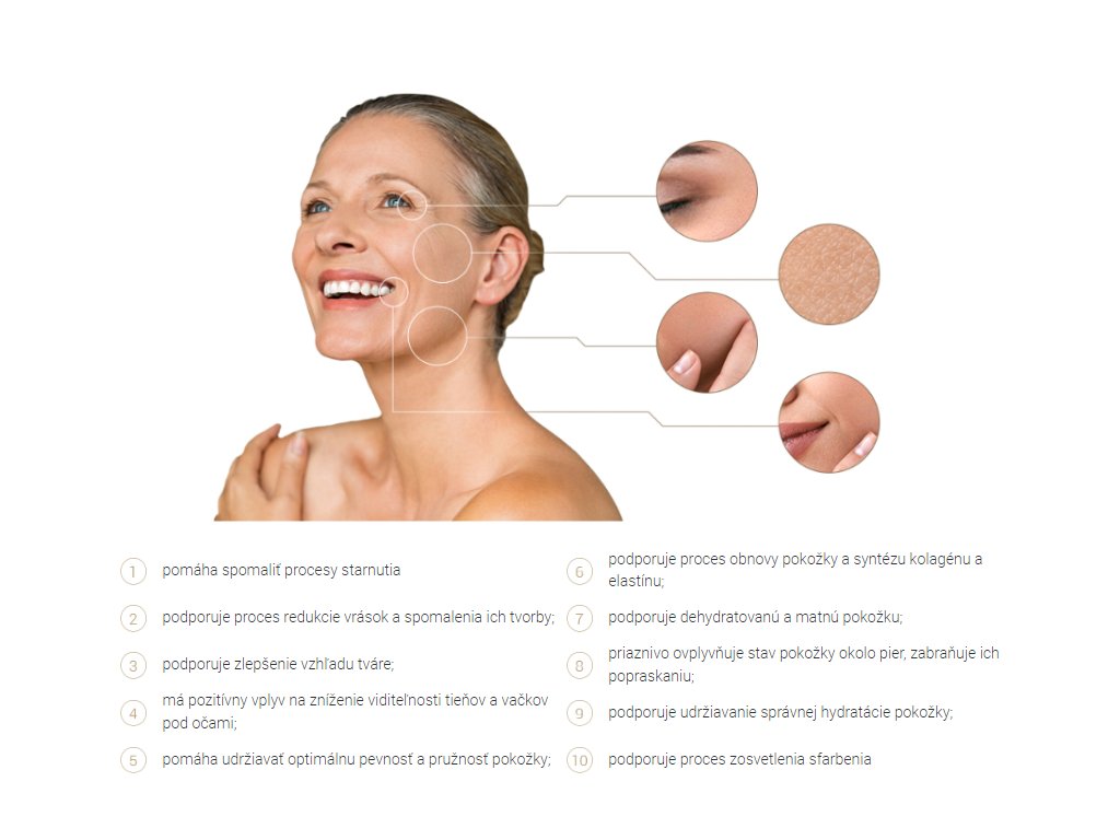 Až dve patentované receptúry a starostlivo vybrané účinné látky pomáhajú spomaliť proces starnutia pokožky a redukovať vrásky a podporujú zlepšenie hydratácie a udržanie správnej kontúry tváre.