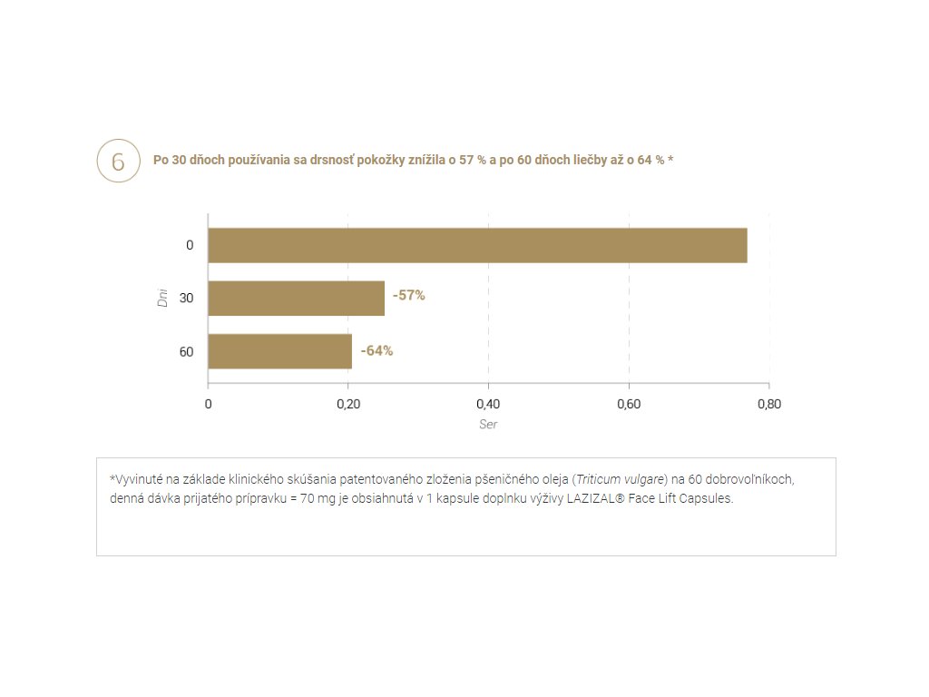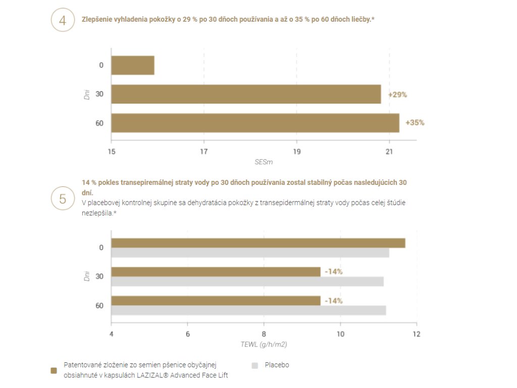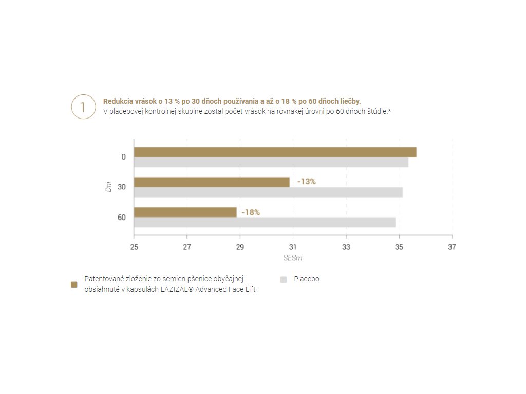 Klinické skúšky potvrdzujú a zaručujú tie správne účinky. Boli vykonané podľa zlatého štandardu výskumu: boli randomizované, dvojito zaslepené, kontrolované placebom a boli vykonané celkovo u 80 dobrovoľníkov. Dávka použitá pri výskume - 70 mg pšeničného oleja - je obsiahnutá v 1 kapsule kapsúl LAZIZAL® Advanced Face Lift.