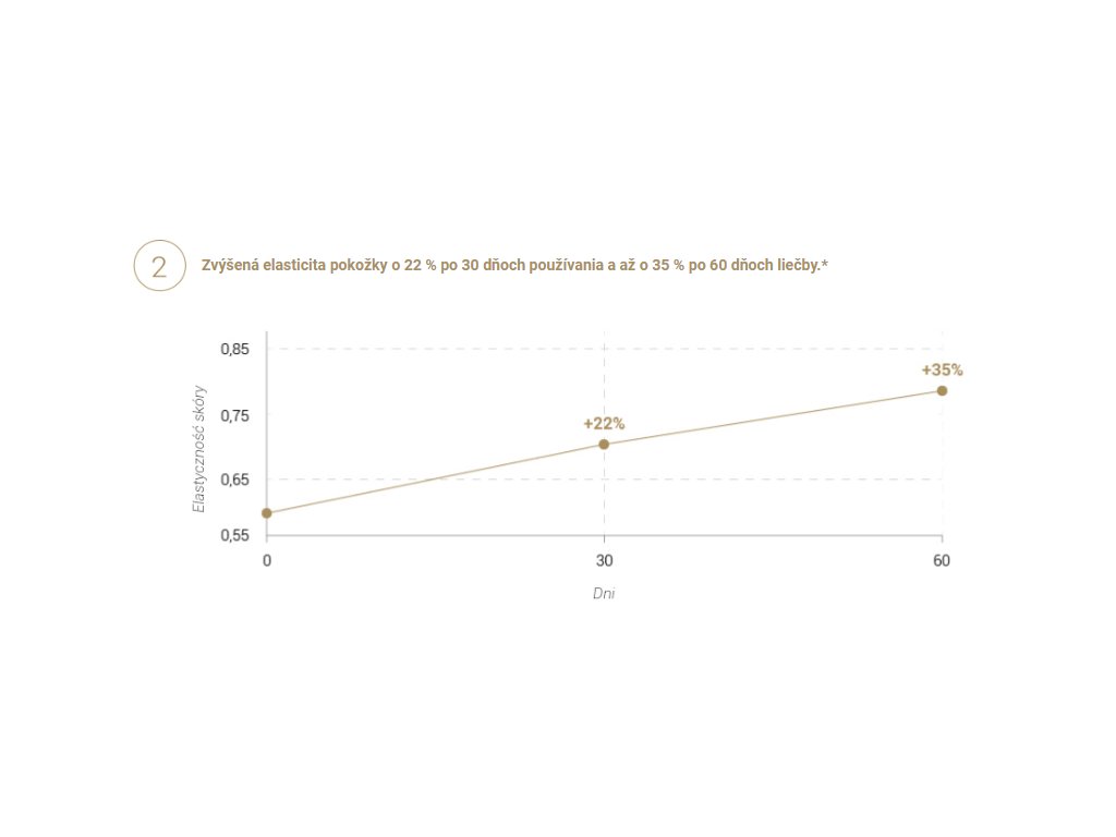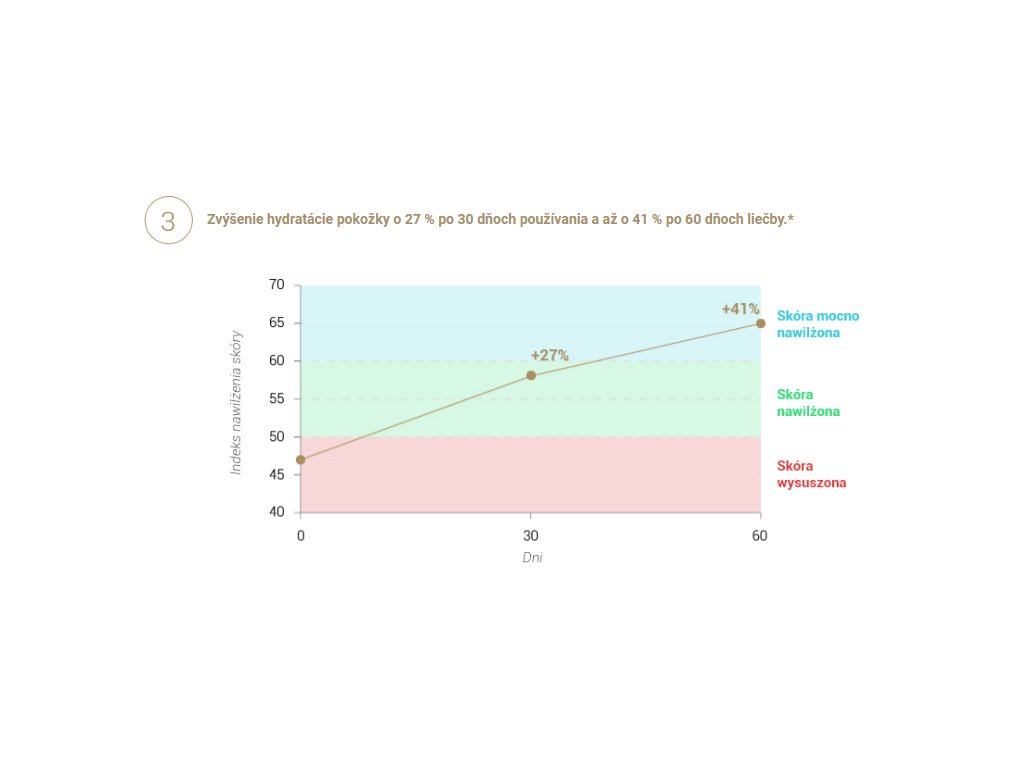 Klinické skúšky potvrdzujú účinnosť patentovaného zloženia. Už po 30 dňoch používania je pokožka viac hydratovaná, vyhladená a elastická a vrásky sú menej viditeľné.