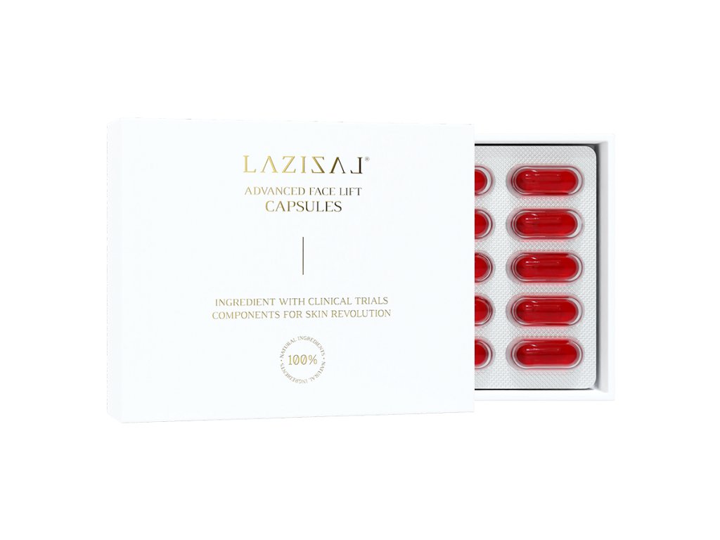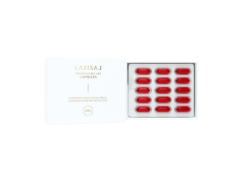 LAZIZAL® Advanced Face Lift Capsules je výživový doplnok podporujúci funkcie a stav pokožky „zvnútra“. Kompozícia prírodných zložiek je obsiahnutá v inovatívnych dvojfázových kapsulách s modifikovaným predĺženým uvoľňovaním, ktoré zlepšujú absorpciu aktívnych látok. Lazizal Advanced Face Lift Capsules® obsahuje až dve patentované formuly, vrátane lipidového komplexu z pšeničného oleja a antioxidačných, zdraviu prospešných bioflavonoidov. Prípravok je zdrojom cenných aktívnych látok podporujúcich optimálne funkcie pokožky. Prírodné vitamíny E, C a beta karotén (provitamín A), fytoceramidy, rastlinné extrakty a kyselina hyalurónová podporujú správnu pružnosť a hydratáciu pokožky a pomáhajú redukovať vrásky.