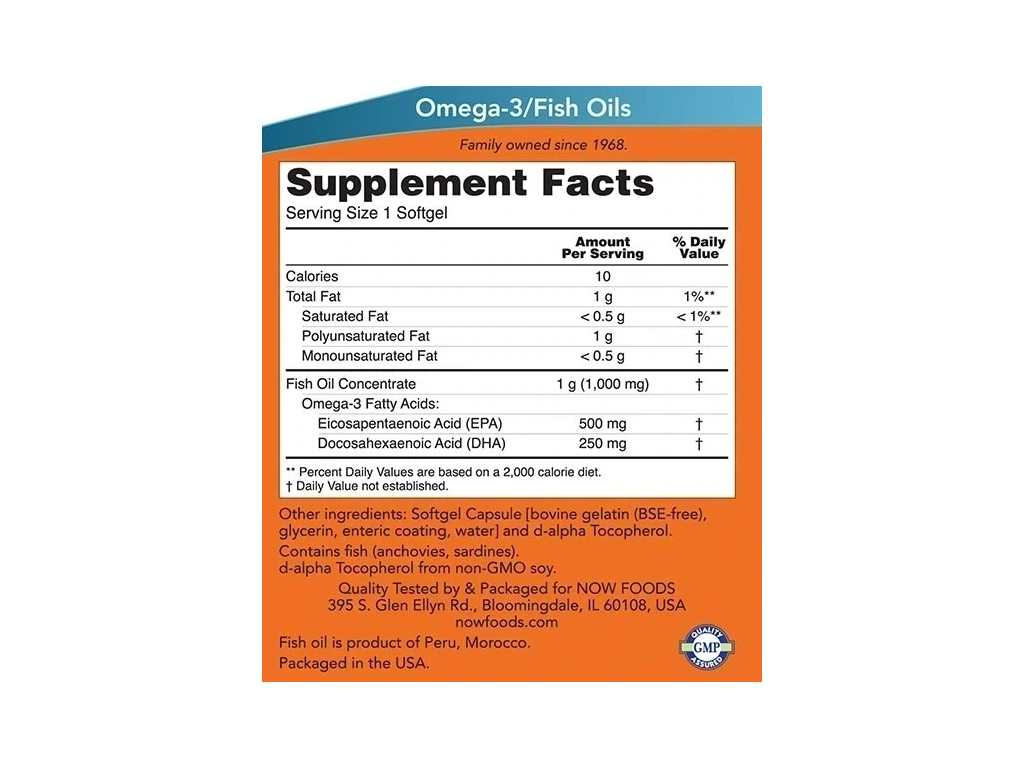 Ultra Omega-3 od značky Now Foods predstavuje kvalitný doplnok stravy s vysokou koncentráciou omega-3 mastných kyselín EPA (500 mg) a DHA (250 mg) v jednej kapsule. Tieto esenciálne tuky sú nevyhnutné pre správnu funkciu mozgu, srdca a cievneho systému. Produkt je navyše vyrobený s enterickým obalom, ktorý pomáha znížiť nepríjemné pocity po požití (napr. rybí reflux) a zlepšuje vstrebávanie v črevách.