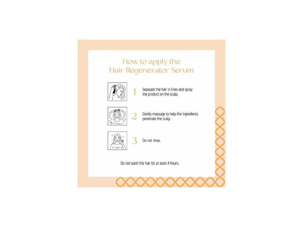 Regeneračné sérum: Rozdeľte vlasy na časti, nastriekajte na pokožku hlavy, jemne vmasírujte. Neoplachujte. Nechajte pôsobiť minimálne 4 hodiny. Možno aplikovať na suché aj vlhké vlasy.